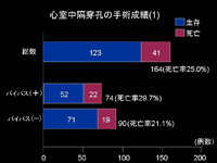 スライド33左室乳頭筋断裂の手術成績の内訳を示す。横軸は症例数を示す。 左室乳頭筋断裂の手術は25例に行われ、死亡率は44.0%であり、前回の29.1%より著明に上昇し、成績は悪化した。 このうちバイパス術を同時に行った症例は7例(28%)で、その死亡率は42.8%で、行わなかった18例(72%)の死亡率44.4%であった。 |