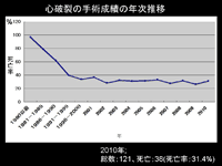 スライド34心破裂の手術成績の年次推移を示す。 心破裂の手術成績は1980年代、90年代は年々向上してきたが、最近10年はあまり変わっておらず、相変わらず高い死亡率である。今回の手術死亡は31.4%と前回の26.5%より上昇し、成績は悪化した。 |