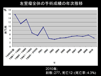 スライド36ここからは慢性期の心筋梗塞合併症に対する手術成績を述べる. 左室瘤全体の手術成績の年次推移を示す。横軸は年次、縦軸は死亡率を示す。 左室瘤総数(同時に虚血性僧帽弁閉鎖不全症の手術を行ったものを含む)の手術成績は最近は安定した成績である。今回の手術死亡率は4.3%で、前回の5.76%より低下し、良好な成績であった。 |
